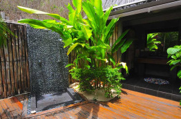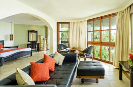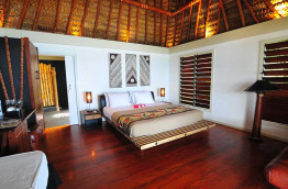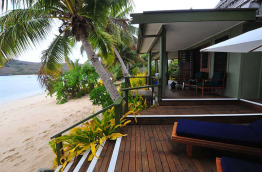 1 Deluxe Beachfront Suite, il s’agit d’une luxueuse villa de deux chambres avec un salon et une cuisine, équipée de l’air conditionné, coffre-fort, minibar, accès internet Wi-Fi, nécessaire à thé et café. La terrasse est aménagée de chaises longues, hamac, et parasol.