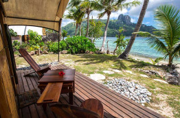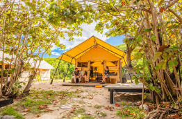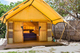 4 Beachfront Safari Bures sont construites telles des tentes de safari, avec des murs en toile. Elles mesurent environ 34 m2, et donnent sur une petite terrasse privative vue mer. À l’intérieur, on retrouve un lit queen-size, un canapé et une salle de bains privative semi-extérieure.