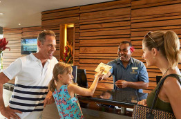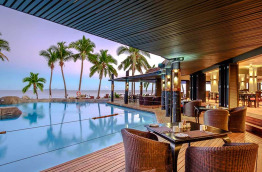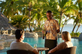 Le Lounge Bar est ouvert toute la journée, en bord de piscine, et propose un grand choix de boissons dans un cadre magique face à la mer, avec au loin la silhouette des îles Mamanuca.