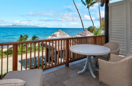 6 Nanuku Suites de 60 m2 sont situées à l’étage d’un bâtiment sur deux niveaux. Bien que ces chambres n’aient pas de piscine privée, vous bénéficiez d’une belle vue sur la mer et sur les jardins depuis votre balcon. Celui-ci est équipé de chaises longues.