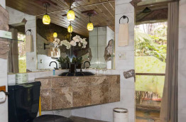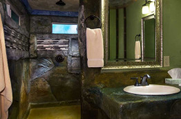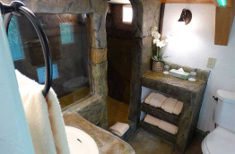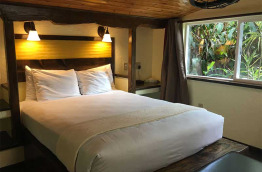 Le bungalow offre en plus une baignoire dans la salle de bains, et c’est également la chambre qui offre la décoration la plus originale avec une présence importante de pierre.