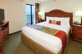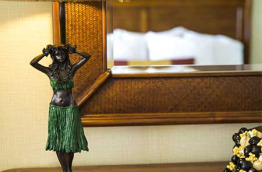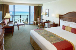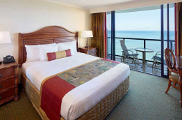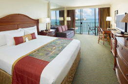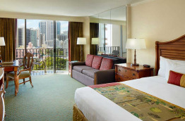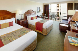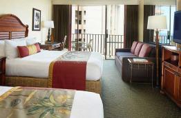 L’hôtel Outrigger Waikiki Beach Resort a été rénové en 2012. Le style d’origine, très classique a été conservé ; on reste dans des couleurs de mobilier et de tissus assez sombres, la salle de bains est petite, mais la chambre est spacieuse, suffisamment pour accueillir jusqu’à 4 personnes. Les baies vitrées apportent beaucoup de lumière, et chaque chambre a un « lanai » (balcon).
