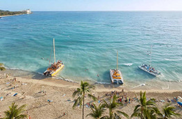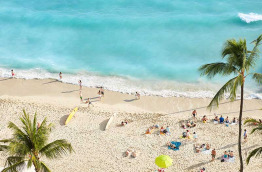 La plage de Waikiki est très longue, mais pas toujours très large à cause des effets négatifs de l’érosion. La portion de plage devant le Outrigger Waikiki Beach Resort est magnifique, certes pas déserte, mais le sable est beau. Même à marée haute, il restera toujours une belle plage généreuse. La plage est aménagée, les chaises longues ont été confiées en location à une entreprise extérieure (comme sur toute la longueur de Waikiki).