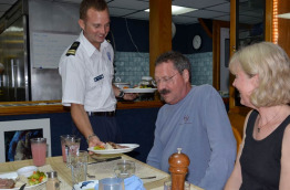 Le petit-déjeuner et le dîner sont servis à table. Le déjeuner est servi sous forme de buffet, et généralement à l’extérieur. Entre les plongées du matin et de l’après-midi, des en-cas sont disponibles.