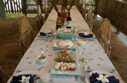 La restauration à Lissenung Island Resort fait la part belle aux produits locaux, qu’ils proviennent de la mer, des jardins des environs, ou du propre potager de l’île. Le repas est l’occasion d’un moment de grande convivialité autour d’une grande table commune.