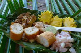 Le petit-déjeuner continental est servi dans le restaurant. Il se compose de fruits frais, de yaourt maison avec muesli, de pain et confiture maison, et parfois même de brioche, fifiri (beignets traditionnels polynésiens) ou encore de crêpes selon les jours.