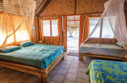 La pension compte 8 bungalows construits dans un style à la fois simple et traditionnel, décorés avec des matériaux locaux. Ils sont répartis sur la plage ou sur pilotis au-dessus du lagon. Simples et fonctionnels, ils sont équipés d’une salle de bains avec douche (eau à température ambiante), et d’un ventilateur.