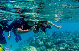 Durant votre séjour, vous participerez à l’excursion Randonnée palmée dans le lagon : équipés de palmes, d’un masque et d’un tuba, vous partagerez des moments privilégiés aux côtés des raies manta dans le jardin de corail.