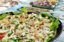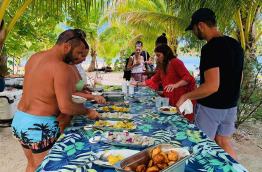 Vous débarquerez rapidement sur un motu, îlot de sable blanc. Les cuisiniers polynésiens partageront avec vous leurs astuces pour râper la noix de coco, tout en extrayant le lait qui servira à la préparation du déjeuner. Vous vous installerez ensuite les pieds dans l’eau et profiterez d’un pique-nique à base de plats locaux, de punch et de jus de fruits.