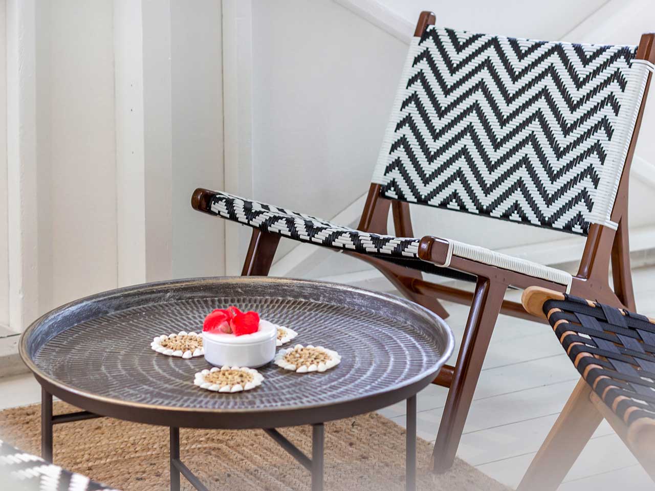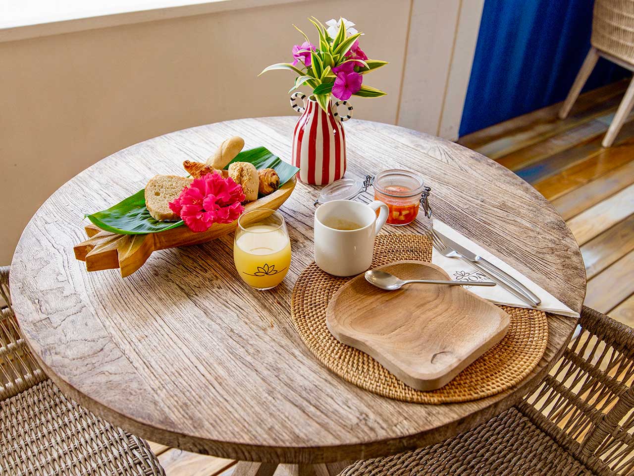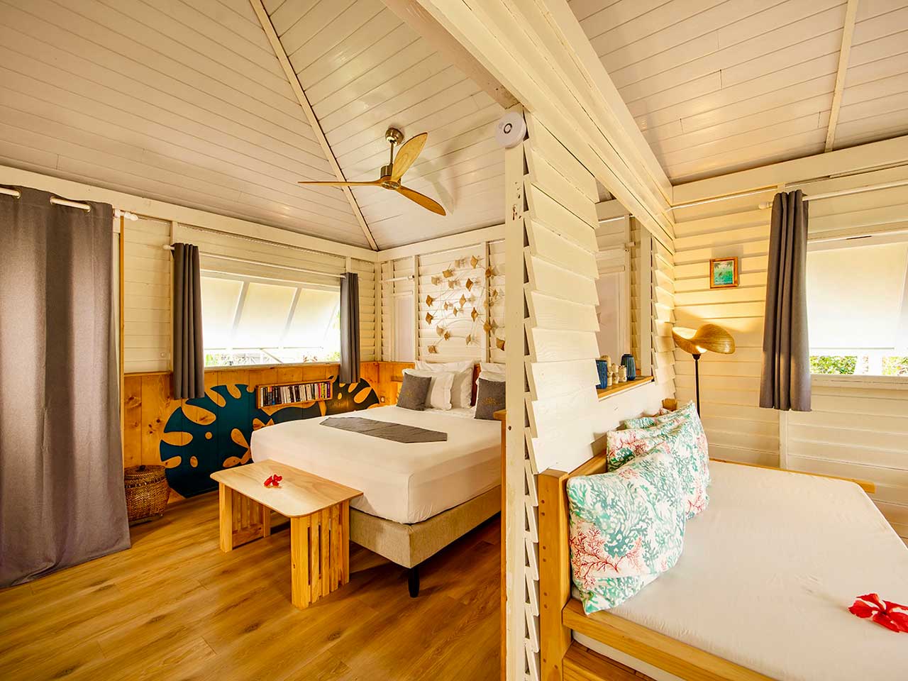 Chaque bungalow est décoré dans un style tropical, clair et épuré, avec du mobilier en bois, notamment du teck cérusé blanc. Des matériaux locaux contribuent au charme, comme des fibres de cocotier et des racines de miki-miki pour les luminaires.