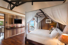 16 Overwater Villas de 116 m2 sont construites sur pilotis au-dessus du lagon. Ce sont les plus proches de la plage. Elles sont équipées d’un lit king-size, de fenêtres entièrement rétractables et d’un accès direct au lagon depuis la terrasse.