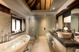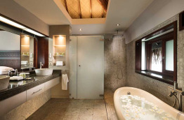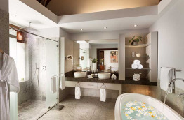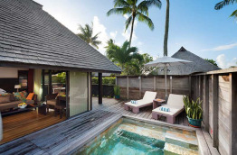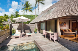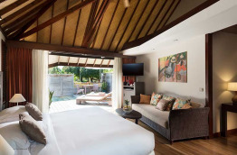 19 Garden Bungalow with Pool incluant une piscine privée et une grande terrasse ensoleillée. D’une superficie d’environ 75 m2, ils sont décorés dans un style contemporain polynésien et disposent des équipements les plus modernes. Les bungalows sont des unités communicantes pouvant être réservées séparément. Ils bénéficient d’une vue sur la plage ou les jardins.