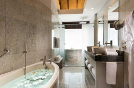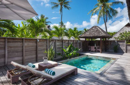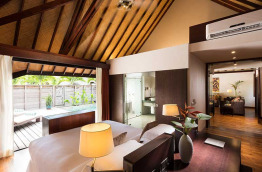 26 Deluxe Garden Bungalow with Pool, identiques en services, mais plus grands (88 m2) et non mitoyens pour une intimité totale. Ces unités sont situées à proximité de la plage et de la piscine.