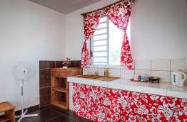 Le Bungalow avec Kitchenette nommé Puarata offre les mêmes équipements que les Bungalows Standard, mais compte en plus un coin kitchenette, avec double cuisinière électrique, petit réfrigérateur et accessoires de cuisine.