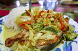 Le dîner est servi à 18 h 00. Il comprend un plat à base de poisson et légumes de saison, des fruits et de l’eau. Des bières locales et des cocktails sont également disponibles en supplément.