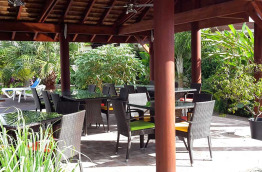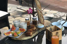 Un copieux petit-déjeuner local vous sera servi chaque matin devant la piscine, avec fruits tropicaux et confitures, pain « coco », fifiris, et gâteaux maison.