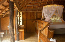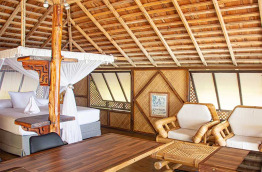 1 Honeymoon Bungalow est idéal pour les couples. Pouvant accueillir jusqu’à deux personnes, il dispose d’un lit king-size à baldaquin. Sa terrasse équipée de chaises longues offre une vue sur le lagon.