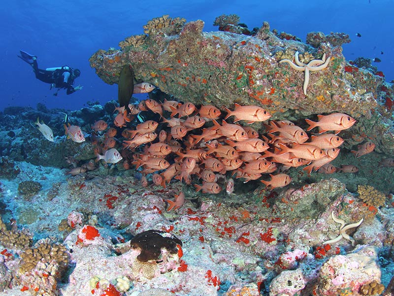 La plongée à Tahiti est riche de surprises, avec des paysages et une faune très variés : tombants, grottes, champs de coraux, etc. Les sites sont nombreux, dans le lagon et dans les passes, et l’on peut croiser au cours de la même plongée requins, poissons-clowns, nudibranches, balistes, anémones, carangues, barracudas, tortues, raies. D’août à octobre, vous pourrez également observer l’une des plus grandes concentrations de baleines à bosse (megaptera novaeangliae) des Îles de la Société.