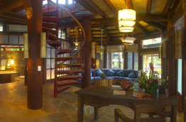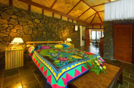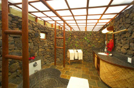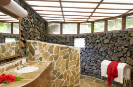 3 Coco Suite sont composées d'une chambre avec un lit king-size, et un grand salon qui peut se transformer en seconde chambre. Le style est résolument polynésien, avec une part importante au bois, et à la pierre. Elle est pourvue de 2 salles de bains avec murs en pierre volcanique, et baignoire en pierre creusée dans le sol. Le toit de la salle de bains est translucide de façon à laisser entrer la lumière, et la partie supérieure du mur est ouverte afin de laisser circuler l’air. Cela peut donner l’impression de prendre sa douche en pleine nature. Les deux chambres peuvent être fermées par des persiennes, et dans cette configuration elles peuvent loger confortablement 4 personnes. Enfin, chaque Coco Suite bénéficie d’une terrasse couverte privée avec une vue sur les jardins, et entre le feuillage, on distingue l'océan.