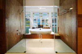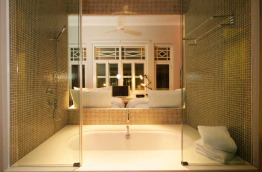 Les 4 Aqua Rooms sont plus spacieuses avec 32 mètres carrés de surface et donnent sur la rue Bukit Pasoh Road. Leur salle de bains avec baignoire est intégrée dans un espace vitré dans la chambre.